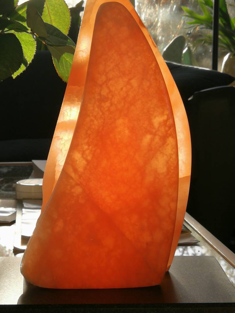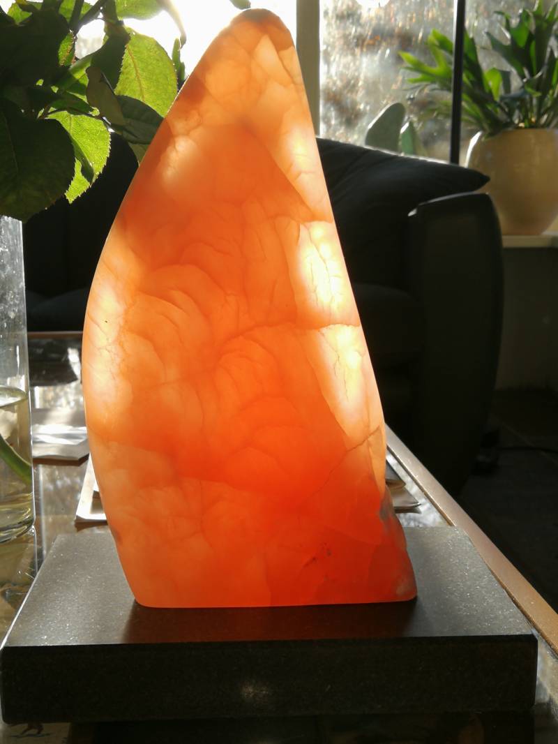 oranje seleniet, op hardstenen sokkel. Inclusief sokkel 30 cm hoog (2018)