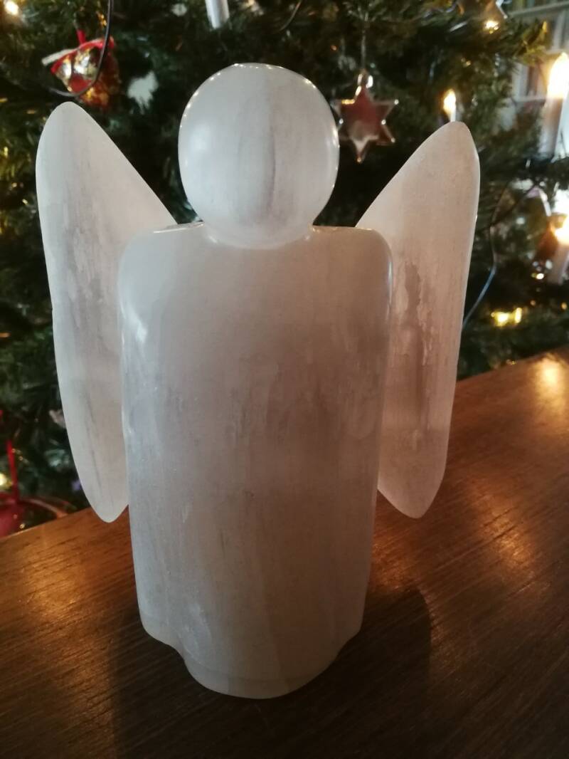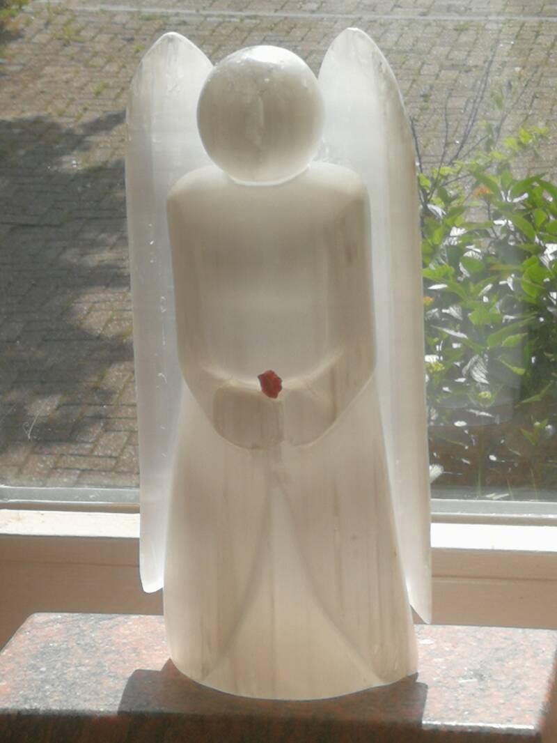 Engeltje van twee kleuren seleniet, 16 cm hoog. (2020)