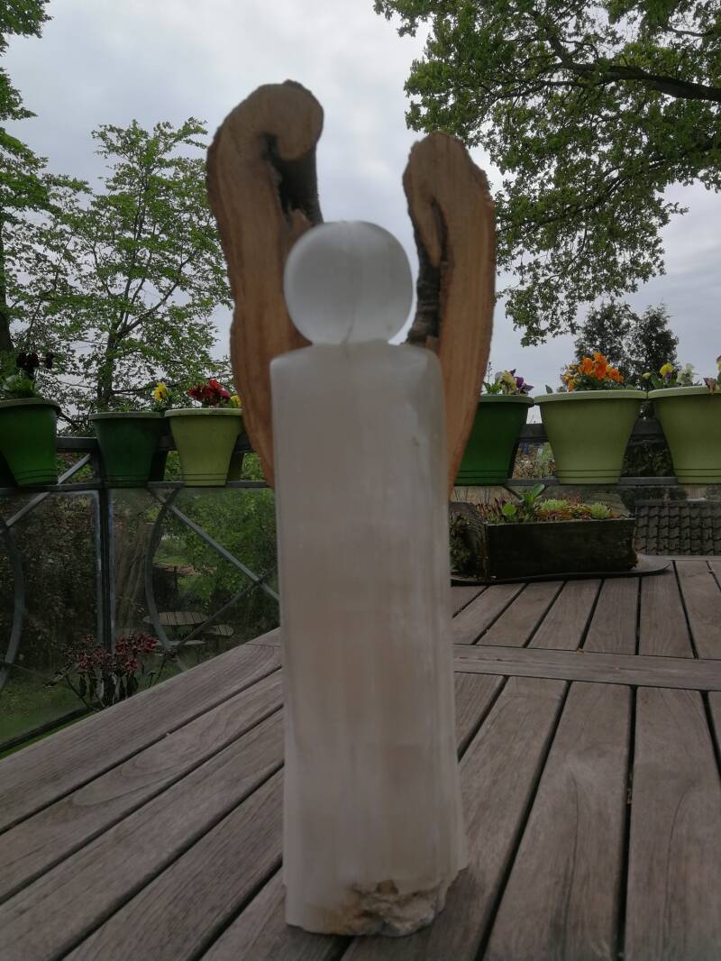 Engel van seleniet met houten vleugels (2021).